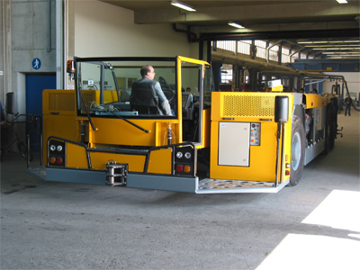 Noch vor dem Erstflug der A380 ist Mitte März 2005 die Überprüfung und Inbetriebnahme aller Systeme abgeschlossen und ich kann den neuen Flugzeugschlepper AST-1 X zum ersten Mal "auf eigener Achse" aus der Montagehalle fahren. |