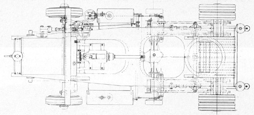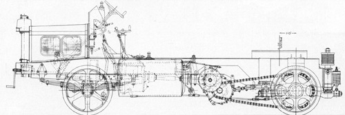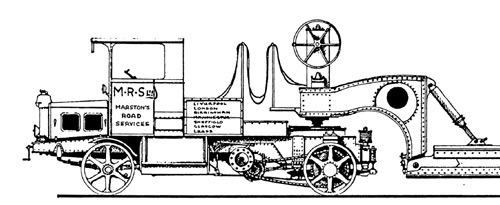 Die Fahrgestell-Zeichnung des ersten Scammell 100-Tonner, gebaut für M.R.S. Marstons Road Service (Registration KD 9168), hier noch mit der kurzen Motorhaube für den Vierzylinder Benzinmotor. |