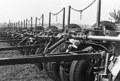 Weltweit einer der ersten Tieflader mit Tiefbett und beidseitig abfahrbaren Fahrwerken mit mechanischem Achslastausgleich. |